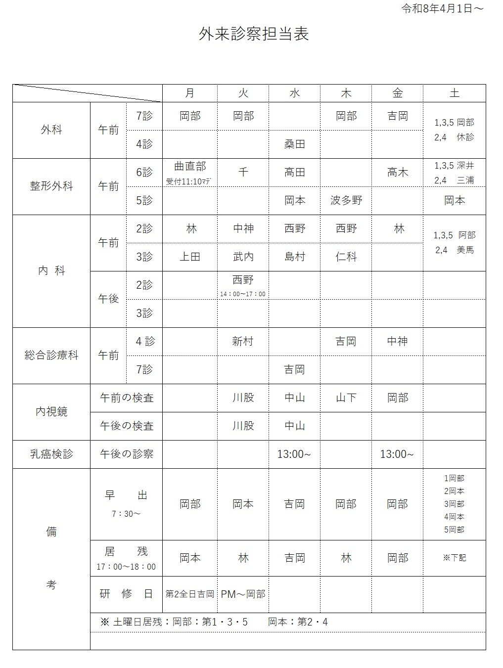 | 2026.3.31 | 内科 | 西野 | 休診 |